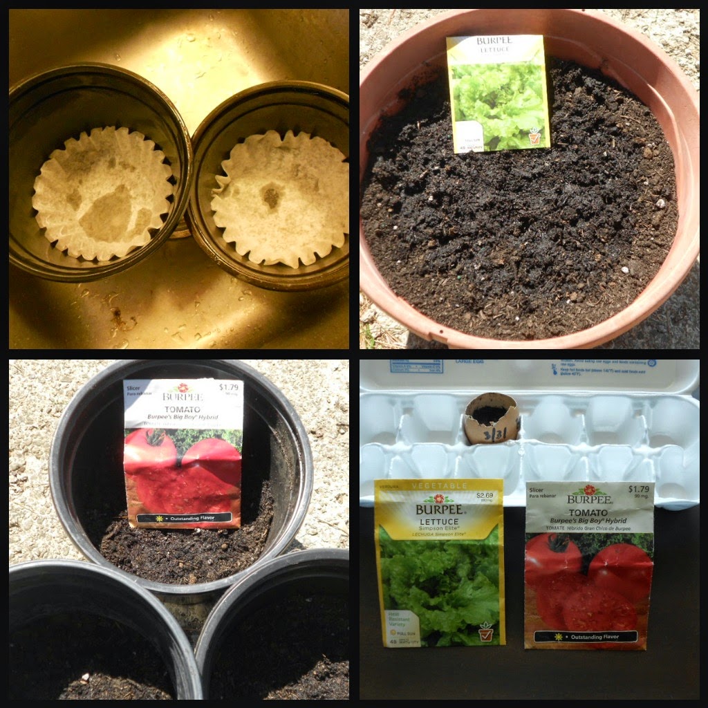 I only had one good eggshell from breakfast the other day, so planted one Burpee's Big Boy Hybrid yesterday from seeds that I had on hand, then bought more dirt and some lettuce seeds when I was out yesterday. I grabbed some pots this afternoon that I had saved and planted four Simpson Elite lettuce seeds in the larger pot, then two more Big Boy tomato seeds in each of three slightly smaller pots.